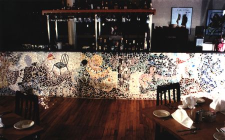 My first large scale mosaic installation, completed in 1989, wraps around this Northampton restaurant for about 50'. It includes the fanciful imagery of mermaids, moons, suns, musicians and of course, food and wine.